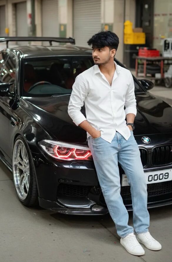 Create a image use my face accurate 100%. A young man 20year old was leaning on fully modified BMW M5 sport in black colour the licence number plate ‘0009. He wear white full sleeve shirt and sky blue baggy jeans and white sneakers. Hello looking left side. Demon head light. Five spoke alloy wheel crome. Racing car spoiler