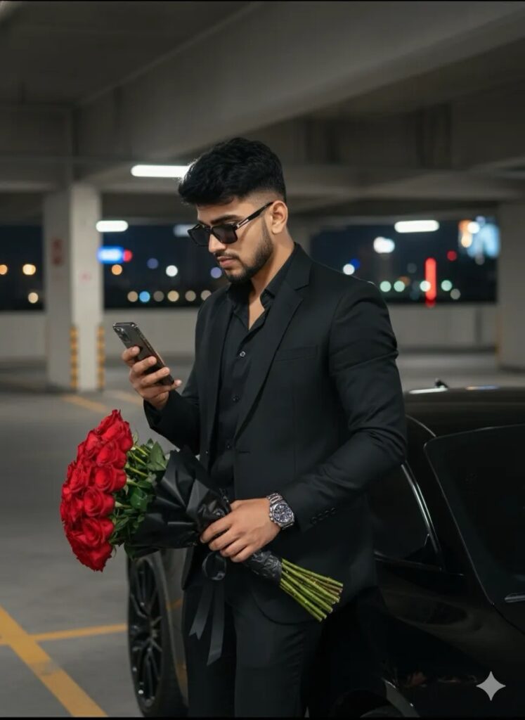 A hyper-realistic cinematic 9:16 portrait based on the uploaded image, keeping the same face and hairstyle of A stylish 23 years boy standing. in a modern city parking lot at night, beside a sleek black luxury car. He is wearing a fitted black suit, black shirt, and black trousers, accessorized with a luxury wristwatch and dark In one he holds a bouquet of fresh wrapped in elegant black paper with ribbon while checking his with the other hand, as if awaiting Face reference 100%.