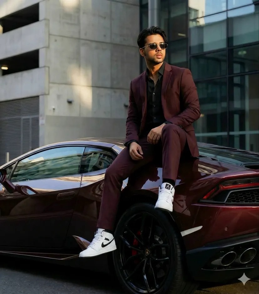 A sharp interplay of soft natural light highlights the sleek curves of a dark maroon Lamborghini with black alloy rims and vivid red brake calipers. At its rear, a casually seated man exudes confident attitude, his silhouette defined by a dark maroon suit paired neatly with a black shirt and pristine white Nike Air Jordan sneakers. His rectangle sunglasses reflect muted surroundings as he looks contemplatively off to the right, capturing a moment of poised stillness. The rich textures of the suit fabric contrast with the car’s. polished metal and gloss, enhanced by subtle reflections and balanced shadows that craft an intimate yet bold atmosphere. The camera perspective centralizes the figure with a focused clarity atop the luxury automobile, emphasizing refined style and relaxed poise in a modern urban backdrop.
