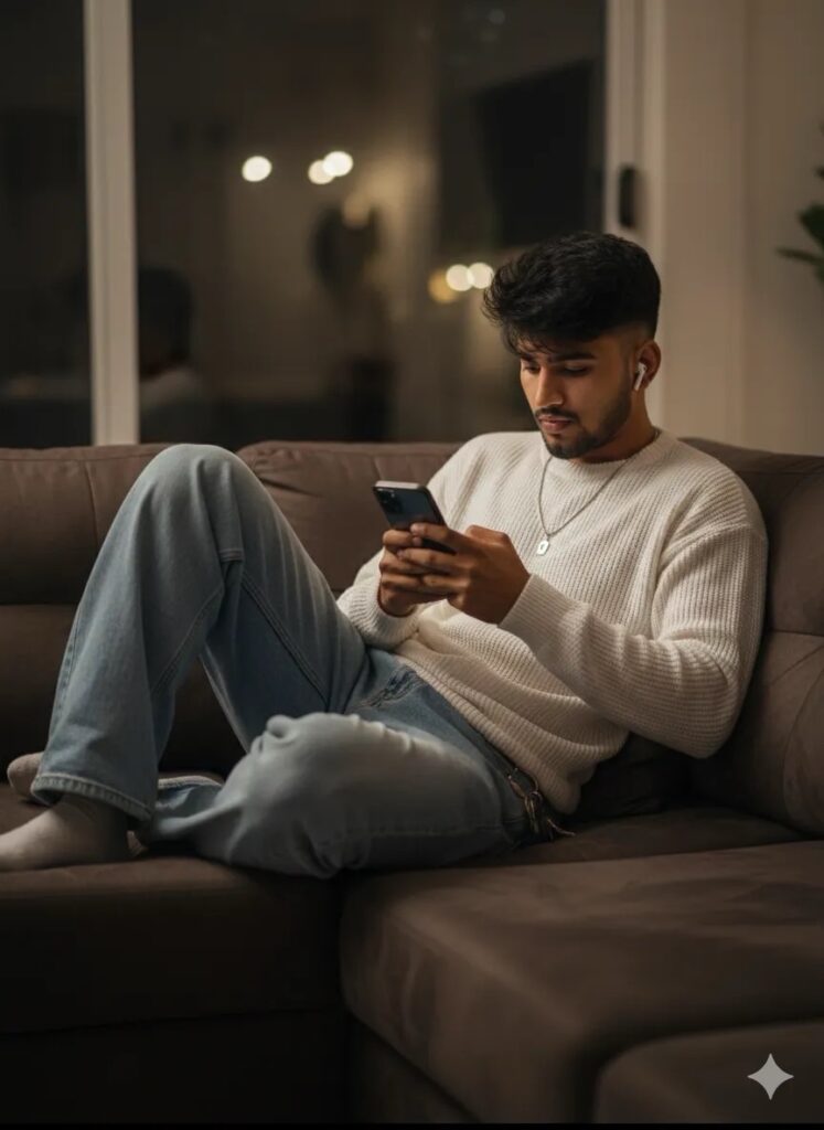 Create an ultra-photorealistic, cinematic portrait. [Using a 100% image as a facial reference]. Full body. “An individual with messy black hair, strands falling across his face, is casually reclining on a dark brown corner sofa. he is wearing white earbuds and a thin necklace with a pendant. He is wearing a loose-knit white sweater and oversized light blue jeans, with keys or a keychain hanging from his belt.
