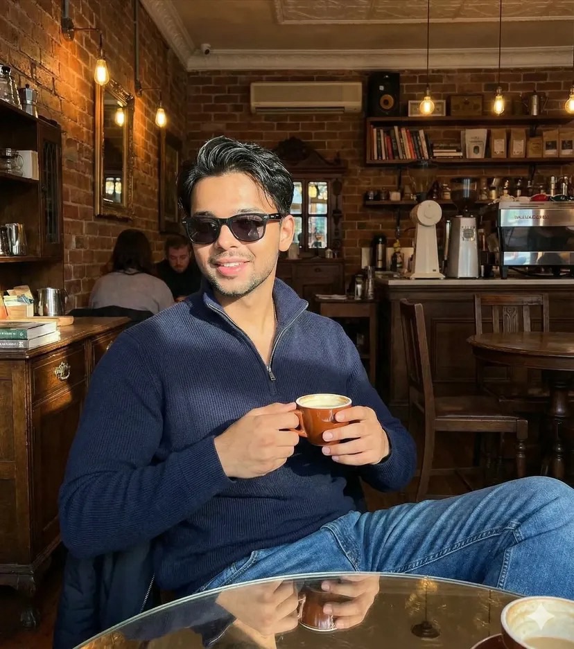 A stylish man enjoying a coffee in a cozy, vintage-inspired cafe and wearing sunglasses, wearing a navy zip-up sweater and jeans, holding a small cup of coffee.”A candid shot of a man relaxing with a coffee in a warm, inviting cafe interior, featuring reflective surfaces and subtle lighting.”A man in a cafe, enhanced with a warm color palette and soft, dappled lighting.