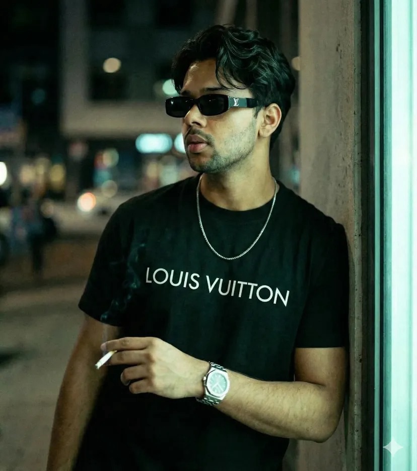 Create a cinematic, moody portrait of the person in the uploaded reference image wearing a black LV shirt standing confidently while smoking a cigarette The person is wearing black slim Rectangle sunglasses and a silver watch, with wavy hair. The lighting is soft teal-green with a slight grainy film look, shallow depth of field, and a soft blurred background to enhance the cinematic.