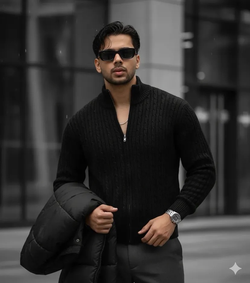 8K hyper-realistic cinematic mid-body portrait of the same young man (keep his exact face as in the reference photo, do not alter or edit his face). The man is posing stylishly in front of a modern black-and-grey urban background, wearing a black cable-knit zip sweater, dark grey trousers, black sunglasses, a silver wristwatch, and a thin chain necklace. He is holding a black puffer jacket casually in one hand while the other hand rests near his waist, giving a natural yet confide.