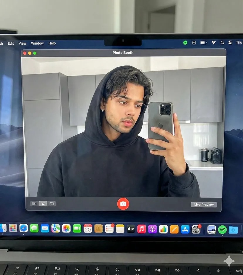 A MacBook-screen “mirror selfie” taken with an iPhone, where the Photo Booth live preview fills most of the frame and is captured from a slightly downward angle that reveals the upper bezel, notch, green camera indicator, and English macOS menu bar, while the lower bezel and softly blurred keyboard sit in the foreground. Inside the Photo Booth reflection, the subject appears in a modern, softly lit kitchen with clean grey cabinetry and a reflective appliance, illuminated by diffused daylight that creates gentle shadows on their face and hoodie. The subject wears a heavy black oversized hoodie with the hood up, loose wavy hair partially visible, a small hoop earring catching light, one hand holding a graphite iPhone with a worn matte case. The color palette blends cool greys, deep blacks, graphite tones, natural skin hues, and the saturated macOS dock icons at the bottom of the screen, alongside subtle moiré and micro-reflection artifacts from photographing a display. Technical assumptions include an iPhone wide lens with low ISO, fast shutter, and Smart HDR processing that keeps textures crisp and shadows soft, contributing to a quiet, introspective digital-domestic mood.