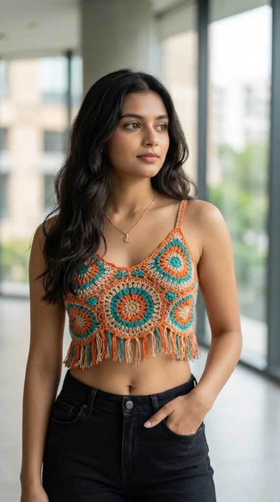 A stylish young woman with long, dark, wavy hair, parted on the side, gazes softly to her right. She’s wearing a vibrant, intricately crocheted crop top with circular patterns in shades of orange, teal, and beige, featuring a fringed hem. Her toned midriff is visible above high-waisted black jeans, and her left hand is casually tucked into the front pocket. She wears a delicate gold necklace with a small pendant. The background is a soft-focus, modern indoor setting.