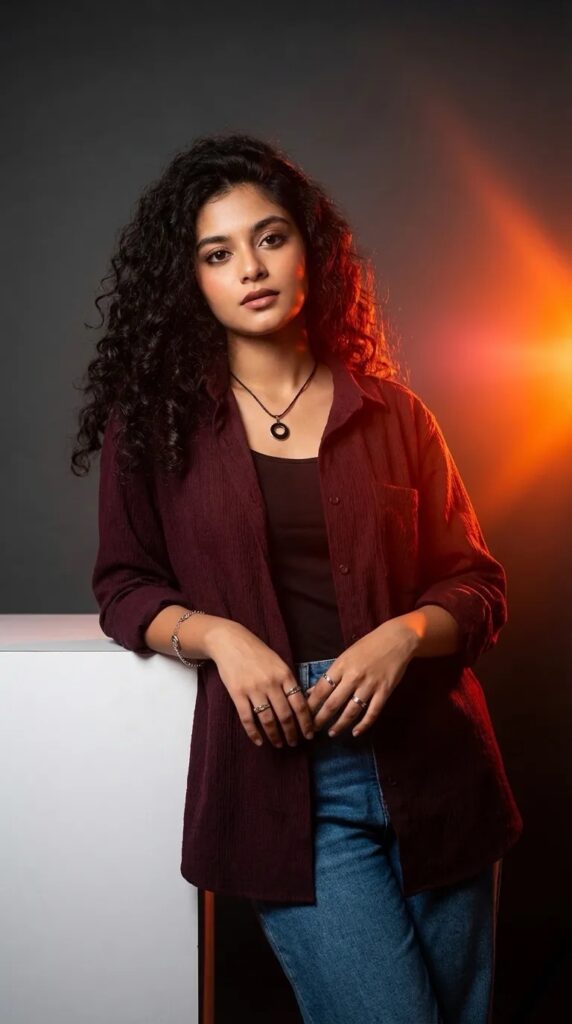 Ultra-realistic of-A full body young girl with dark, curly hair, wearing an unbuttoned dark maroon textured shirt, leaning against a white surface.He has a black necklace with a circular pendant, a silver bracelet, and rings on. He is looking my stylish directly at the camera with a direct gaze.The background is a dark grey wall, with a dramatic orange and red light flare on the right side, creating a moody and artistic atmos phere.Keep my face same 100% same in reference image