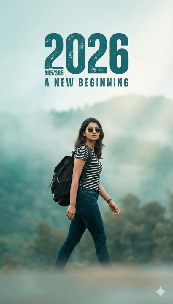 Uploaded girl wearing sunglasses, white and blue batan shirt, blue cargo and left hand black backpack walking confidently across a soft, blurred foreground.The background misty ethereal landscape, dominated by muted teal, blue and light gray tones subject large style text overlay reads “2026” bold, slightly distressed teal font. Smaller text below it says “365/DAYS” and “The Santo” in top.Cinematic, highly-detailed, soft lighting, style, new year. Camera angle is left side.