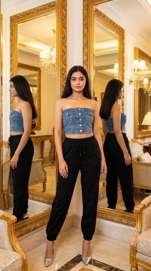 Create 9:16 image with ultra-high-resolution ultra realistic details.Use same face and figure 100percent as uploaded image Of a captive shot of A stunning and confident woman posing in a luxurious, brightly lit interior, reflected in multiple ornate gold-framed mirrors. She is wearing a chic, straplessdenim-style bustier crop top with button detailspaired with comfortable yet stylish black jogger pants and glamorous silver high heels.