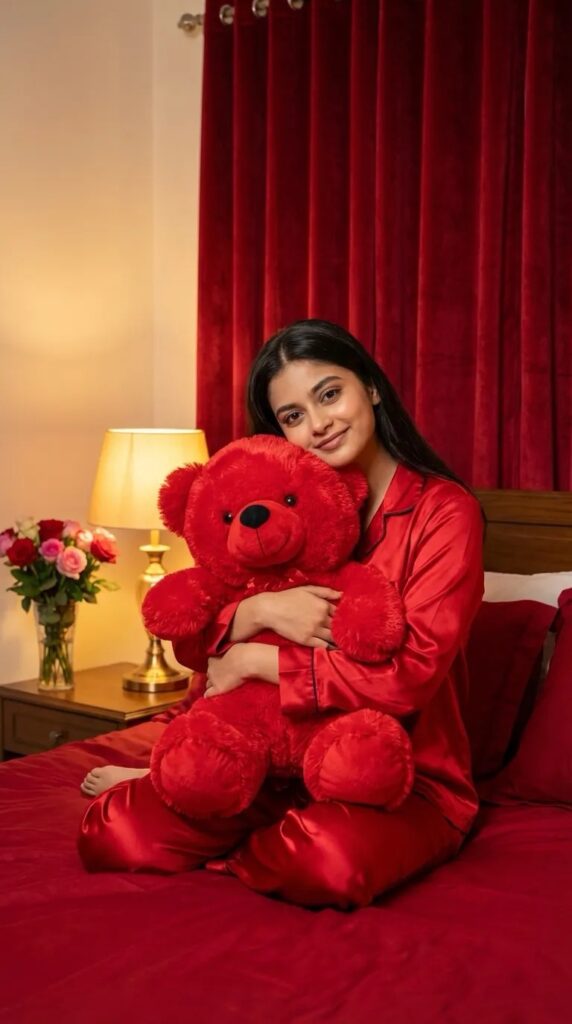 A young 15 years old girl with long, dark hair is smiling softly while hugging a large, fluffy bright red teddy bear. She is wearing bright red satin luxurious pajamas and is positioned on a bed with luxurious red bedding and red curtains in the background. A bedside lamp with a warm glow and a vase of flowers are visible on a nightstand to her left. The overall impression is cozy, warm, and romantic. Don’t change the face. Face must match with the reference picture.