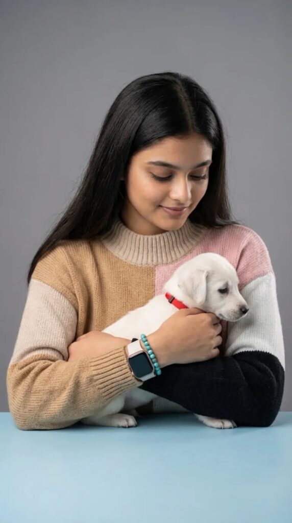 18 years girl (keep her real face unchanged). A girl with medium same brown hair, light skin, and soft features sits relaxed, forearms on a light blue table, holding a small white puppy with a red collar. He wears a cozy color-block knitted sweater (beige, tan, light pink, white, black) with ribbed neck and cuffs, a smartwatch, and a turquoise-beaded bracelet. Soft diffused lighting, smooth, background grey colour.