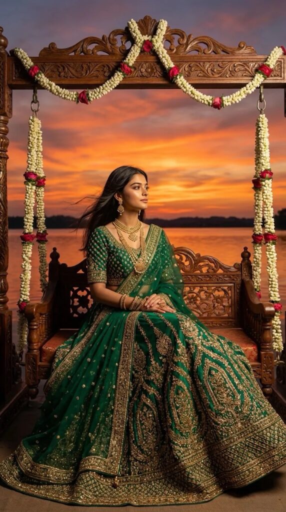 A stunning South Asian woman wearing an opulent emerald-green lehenga with intricate gold detailing sits gracefully on a carved wooden swing wrapped in jasmine and rose garlands. Her long dark hair flows softly in the warm evening breeze as she gazes toward a glowing sunset over a calm lake. Traditional jewelry and subtle makeup elevate her regal charm. The atmosphere feels majestic, serene, and cinematic.