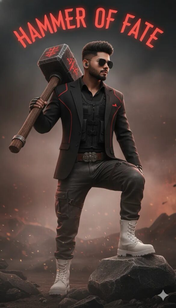 A dramatic full-body shot of a gaming character with same one foot elevated on a rocky or uneven surface. He is holding a large, rustic sledge hammer over his should Character feel no load on hammer His gaze is intense and directed off-camera conveying a sense of strength and determination. The background is dark and smoky dusty suggesting a rugged and in the background text on top”Wearing a black sut with red structure, cargo pants, white shoes, sunglasses.