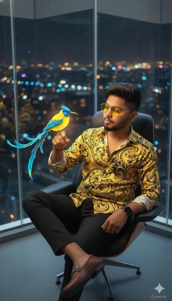 A hyper-realistic of 22 year old young man and he wearing yellow black shilk shirt.deep yellow-tinted sunglasses,He is looking down with a gentle, curious expression,his gaze focused on a small, vibrant,and fantastical bird perched delicately on the index finger of his right hand.The bird has brilliant yellow feathers,a blue head with a long, pointed beak,and iridescent,flowing tail feathers in shades of blue and green. It emits a soft.background full 3d glash wall night,seting man modarn chair,