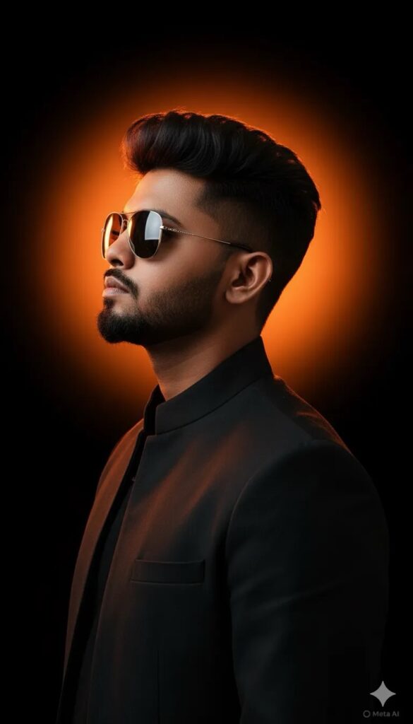 Ultra-realistic cinematic portrait of uploaded man in profile view, wearing a plain black jacket and aviator sunglasses. He has thick, voluminous, well-styled black hair and a neatly trimmed beard. His head is slightly tilted upward, with a calm and confident expression.
