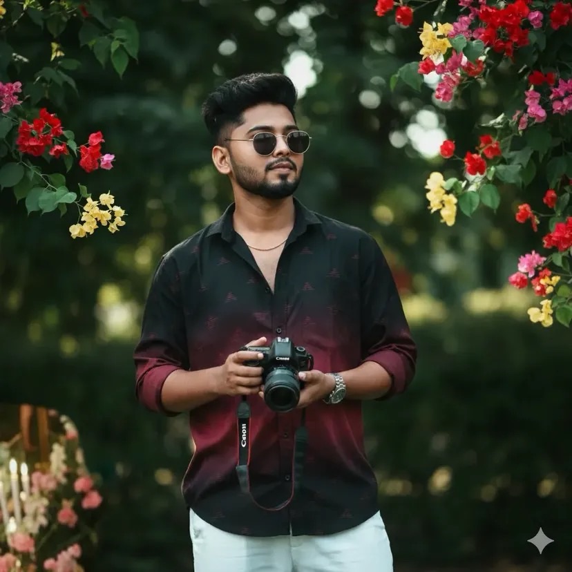 Creat a 8k hyper-realistic dark green portrait cinematic image with dramatic smile actions .(uploaded photo 100% face match) of A stylish handsome young man (refrence image given) with a slightly dark messy hairstyle and wearing a lose black & maroon gradient half lineing shirt and white lose pant. He hold a Canon camera, He is looking thoughtfully off-camera, captured in a candid, high-key cinematic outdoor portrait The composition is framed by a branch of vivid red/pink/yellow.