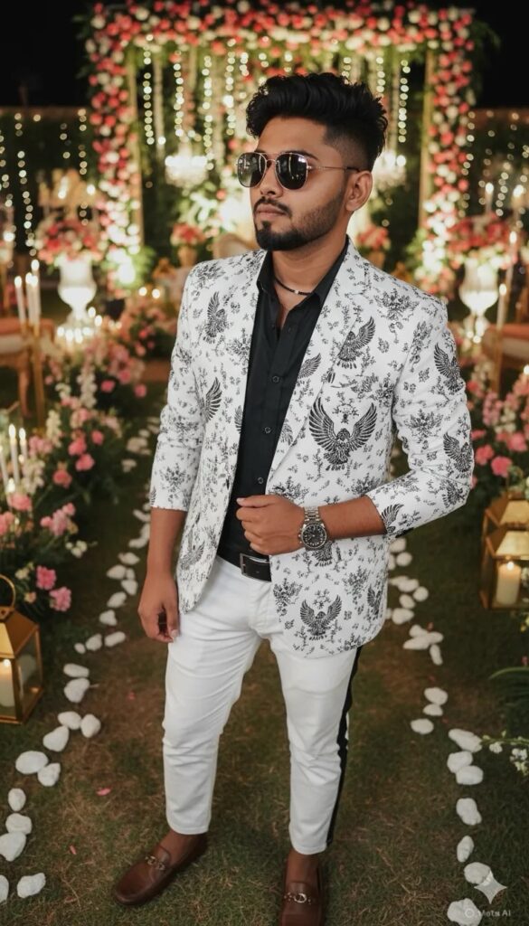 A very handsome young boy with wavy fringe hair style,Half-body, 100% original face & hair, 5’9″, outfit replaced with white hair black printed blazer(Eagle Handmad moti emrodery) and shirt, white haif balckpants, stylish chinos, Luxery watch, small modern sunglasses; naturally confident pose, not looking at camera, expressive eyes; sitting/standing at realistic night wedding ceremony with flowers & stones,DSLR-level clarity, cinematic daylight, ultra-realistic textures.stily change.