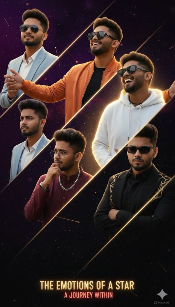 A modern cinematic poster featuring five diagonal panels of the same young man’s face, each showing a different emotion — calm (pastel blue suit, golden sunlight), smiling (orange bomber jacket), laughing (white hoodie, glowing backlight), thoughtful (maroon kurta, metallic chain), and serious (black coat, golden shoulder patterns). Panels cut across a textured cosmic gradient background (dark purple to black) With glowing golden dust and neon red and gold streaks.