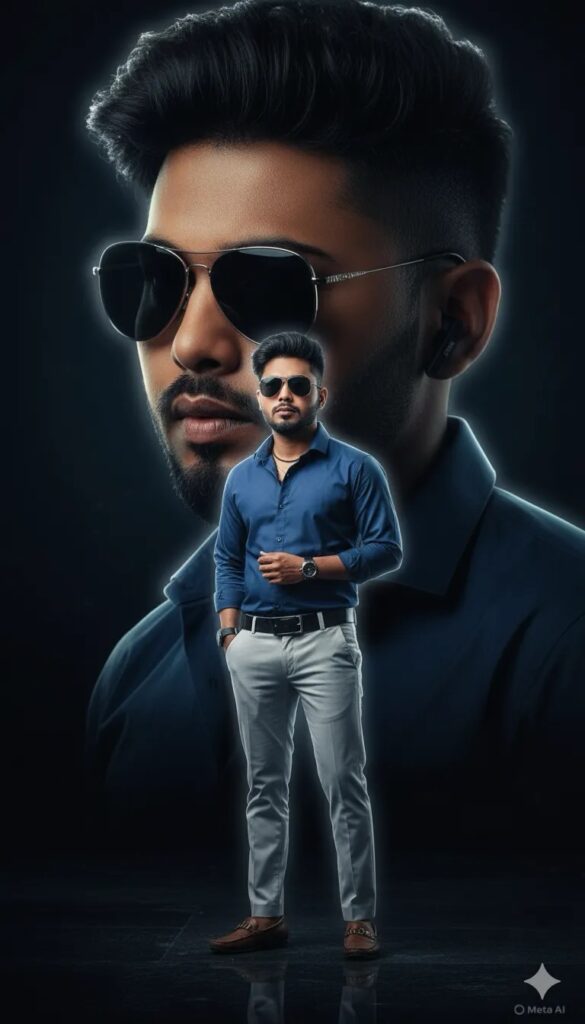 Ultra-realistic 8K dark portrait size poster showing same handsome uploaded man twice in one frame — one real full-body standing with confident pose on a dark surface in front and one large shaded face in background. Wearing blue pant shirt, silver watch, black sunglasses, leather loafers. Dark glossy studio lights, cinematic glow, stylish modern vibe.