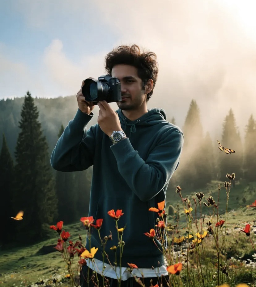 Morning sunlight filters softly through mist and towering redwoods on a foggy mountain slope, casting gentle beams that illuminate a young man with tousled curls. Clad in a crewneck sweater layered under a knotted hoodie, and wearing a rugged watch, he lifts a sleek mirrorless camera to his eye in steady concentration. Vibrant wildflowers cluster around his waist, rendered with creamy bokeh that blurs the natural scene into subtle abstraction. Nearby, delicate butterflies flutter, their movement frozen crisply in shallow depth of field. The slender figure’s calm focus contrasts with the ethereal softness of fog and dappled light, a cinematic color palette highlighting the interplay of cool shadows and warm sunbeams. Detailed textures of knit fabric, skin, and metal grain emerge sharply, all captured with meticulous 8K clarity from a slightly overhead close-up perspective in a 3:4 frame.