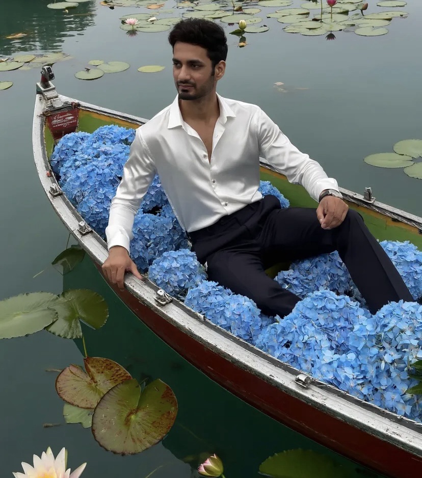 A man styled in an elegant white satin shirt (slightly open collar) paired with tailored dark trousers, posing inside a small vintage boat filled with blue hydrangea flowers, floating on a calm clean lake covered with lily pads and lotus flower. The mood is cinematic, natural, and realistic, lit by soft overcast or late-afternoon natural light (no harsh contrast). Full Body Shot: Wide overhead shot of the full silhouette in the boat, surrounded by flowers and lily pads. Relaxed yet strong pose, highlighting outfit and environment.(Make Same Image From Reference)