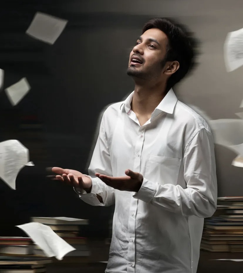 Fine black and white photography of a handsome young man with dark, his head tilted back in a moment of intense creative thought or ecstasy. his Hands are open. He is wearing a loose white collared shirt, standing in a dimly lit study filled with stacks of books and paper’s floats all over. The image is captured with a slow shutter speed, creating dramatic horizontal motion blur that streaks the background and the edges of his form, and super realistic.