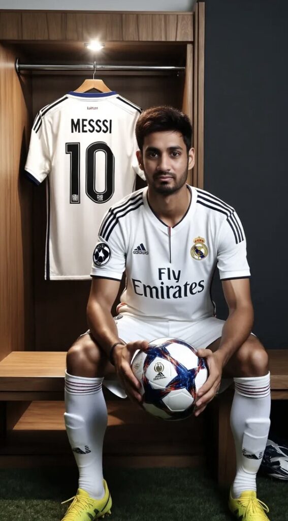 A hyper-realistic, spontaneously captured iPhone photograph of a young adult Indian male football player with a slim body type sitting confidently on a wooden locker room bench. He wears a Real Madrid white home jersey featuring the Fly Emirates sponsor and Adidas logo, paired with white shorts, white knee-high football socks, and vibrant yellow football boots. He firmly holds a UEFA Champions League ball with both hands between his knees, looking directly at the camera with a serious, composed expression and authentic head posture. Behind him, inside a wooden locker, a second Real Madrid jersey with “Messi” and the number 10 hangs perfectly centered, illuminated by focused overhead spotlighting that highlights the detailed jersey text and number. The single soft spotlight casts dramatic contrast and natural shadows across the scene, creating a cinematic locker-room atmosphere with subtle dark vignette edges characteristic of iPhone lighting. Textural realism highlights the fine knit fabric of the jersey and socks, subtle leather grain of the boots, and tactile surface of the football. The framing is intuitively casual yet focused, with a slight tilt capturing genuine intimacy and spontaneity typical of candid iPhone photography.