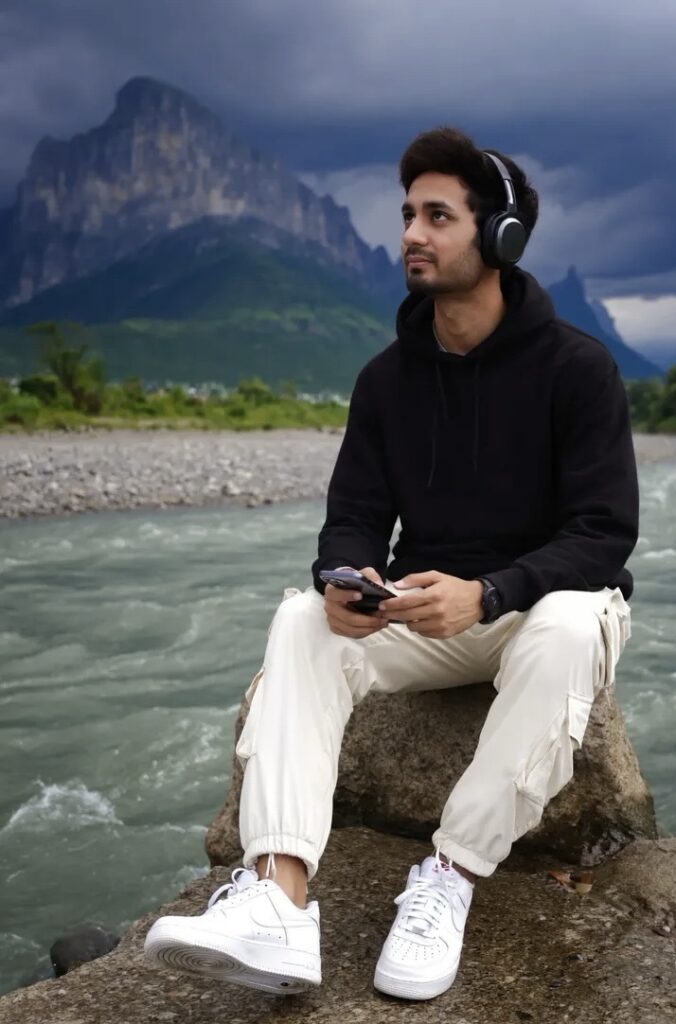 A hyper-realistic 4K full-body portrait of the same young man sitting on a stone at a rainy riverbank. Wearing a black hoodie, cream cargo joggers, and white Nike Air Force 1 sneakers. He holds an iPhone 17 Pro, listening with Apple headphones, looking upward. Background shows a dramatic mountain, storm clouds, dark sky, and flowing river, blurred with cinematic bokeh. Shot in 9:16 ratio from a slightly distant angle showing full body and shoes clearly.