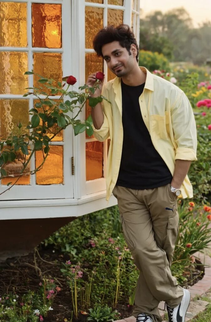 Eye-level cinematic (3:4) full-body portrait, man Using the uploaded picture exactly face leaning on flowering vines beside stained glass cottage window. Casual: smiling at rose, tousling hair, legs crossed. Lush flower garden, creamy bokeh, golden hour. Light yellow shirt, black tee, baggy khaki cargos, Puma sneakers, , luxury watch. Sharp detail, warm grading, natural light. sunglasses brand. do not change or edit my face.