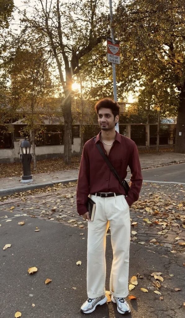 A candid, spontaneous iPhone-style image of a slim young adult Indian male standing casually under a glowing vintage streetlight on an autumn evening. He wears an oversized maroon shirt with a slightly silky texture, half-tucked into off-white wide-leg trousers blending casual streetwear with polished tailoring. His chunky sneakers feature a sleek designer edge, complemented by layered minimalist jewelry, a slim belt, a crossbody bag, and subtle statement rings. His wavy, windswept dark brown hair styled effortlessly in an editorial casual look frames his relaxed posture as he holds a book in one hand. Soft golden sunlight rays filter through swirling autumn leaves, casting romantic contrast and subtle film grain across the scene, evoking a dreamy, retro-modern 90s indie movie mood reimagined for Gen-Z Instagram. Natural shadows contour his face authentically, and the composition is casually tilted with creative framing that emphasizes genuine spontaneity and intimate fashion-forward storytelling characteristic of high-quality iPhone captures.