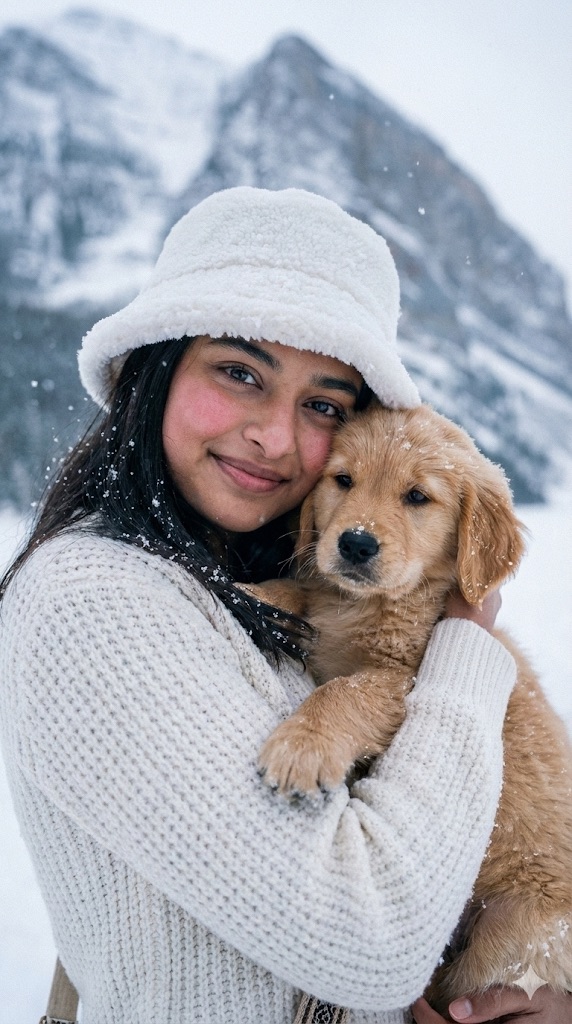 “Ultra-detailed winter portrait, woman hugging a small dog, close-up shot, snow-covered background with strong depth of field separation (f/1.8 look), soft natural overcast lighting, film-style cool tones, reduced saturation, lifted shadows, enhanced whites, micro-contrast + clarity, crisp eyes, realistic skin texture, cold winter mood, fine bokeh, snowy particles visible on clothing, neutral color grading with blue-gray highlights. Hyper-real, photorealistic, MD6 aesthetic. Use same to same face as given reference pic.”