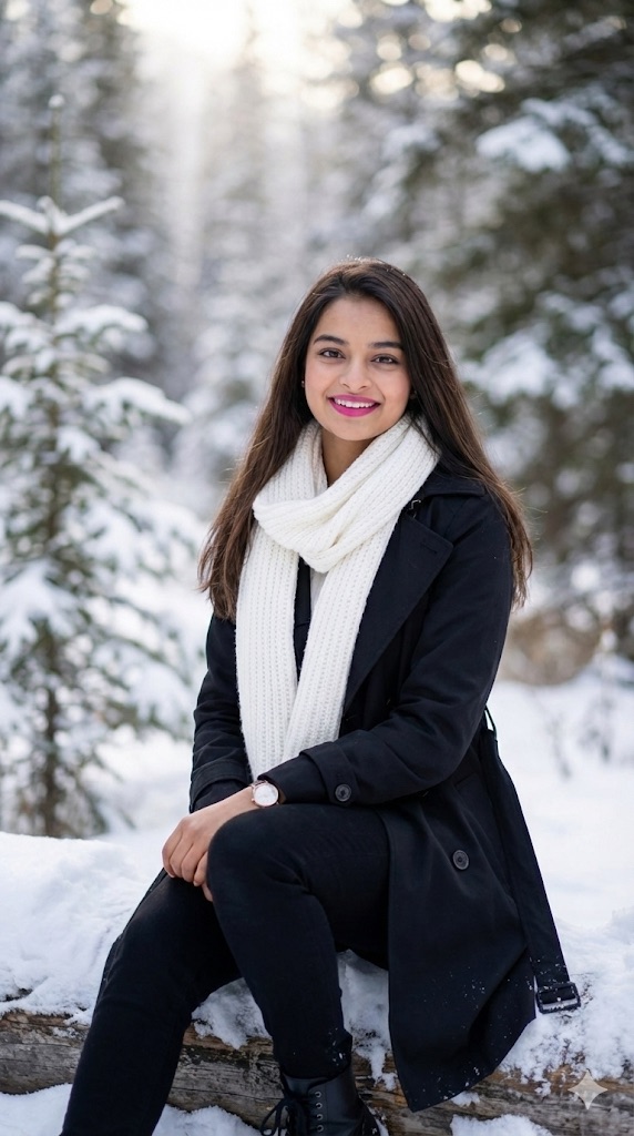 “A captivating portrait of a young woman in a serene snowy forest. She has long, dark brown hair and a warm, soft smile, gazing directly at the viewer. She is dressed in a stglish black trench coat, black pants, and black boots, wristwatch, and pink lipstick. A thick, white knitted scarf is elegantly wrapped around her neck. She is seat on snow of log, The background features a blurred winter wonderland with snow-covered trees and a soft, diffused light, enhancing the tranquil atmosphere. The overall mood is peaceful and enchanting. Use same to same face as given reference pic.”