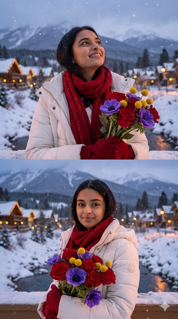“create a ultra realistic portrait cinematic winter portrait collage of a young woman in a snowy mountain village at dusk. she has long dark wavy hair and wears a white winter coat with a red scarf and red gloves. she is holding a bouquet of colorful flowers and standing near a river with snow-covered cabins and mountains in the background, snowflakes are gently falling around her. include two frames in a vertical collage: in the first frame, she looks up toward the sky with a soft smile, holding the flowers, i want exact woman same face as, i uploaded no alteration 100% same.”