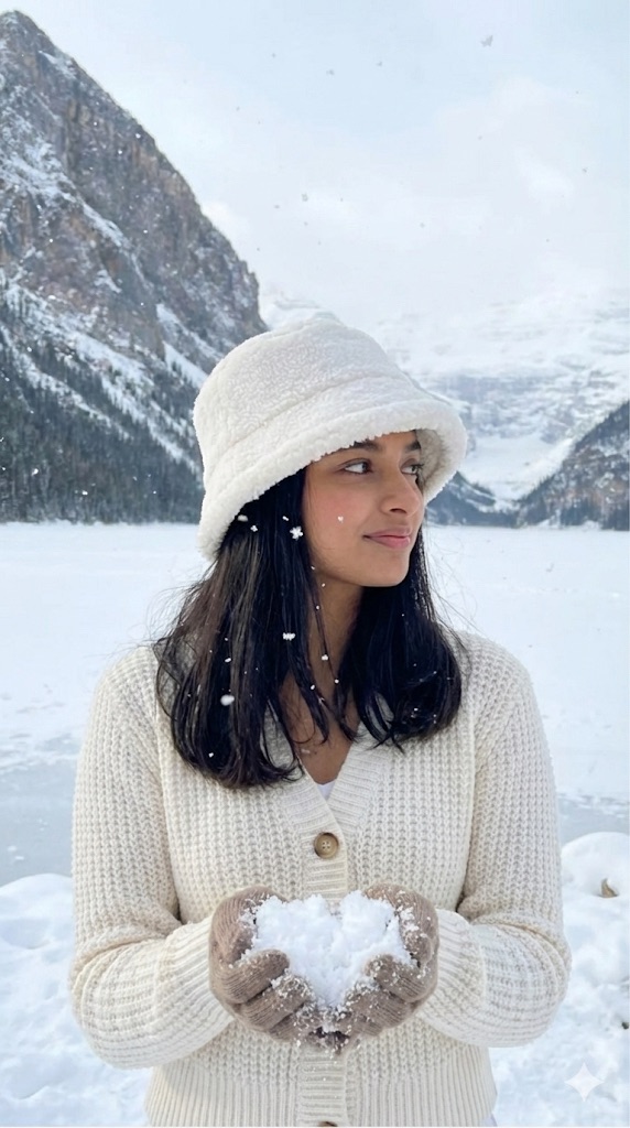 Style/Lighting: Cinematic, detailed, high-resolution photography, soft winter lighting. The young woman’s face and hairstyle match uploaded reference images.”