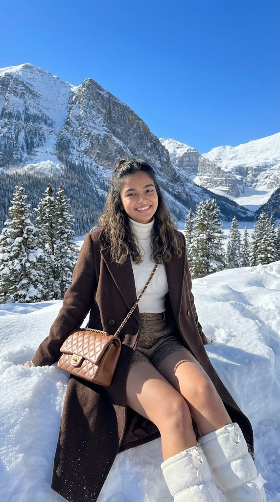 “Create a photograph from the original image. making the face look as similar as possible to the attached image. The subject has long lightly curly hair, half-tied in the middle of the head. They are wearing a long, dark brown coat over a white turtleneck, brown shorts, and white boots. A Chanel bag is slung across their body, close to them showing off their beautiful legs. The background is a stunning snowy landscape, with the subject posing sitting in the snow.”