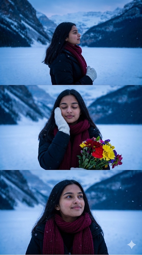 “A beautiful young woman standing in a snowy mountain landscape, captured in a cinematic multi-frame style. she has long wavy dark brown hair, wearing a deep red knitted scarf, black winter coat, and white woolen gloves, light snowfall is gently falling around her. in the first frame, she stands in profile against a backdrop of frozen lake and blue mountains at dusk, in the second frame, she is facing forward with eyes closed, softly touching her cheek with her gloved hand, holding a colorful bouquet of vibrant flowers (reds, yellows, purples). in the third frame, she looks slightly upward with a soft smile, snowflakes falling around her. the lighting is soft, cool, and wintery, with a dreamy, serene mood. ultra-realistic, high-resolution, cinematic color grading, shallow depth of field, crisp details, natural skin texture, winter aesthetic, i want exact woman same face as, i uploaded no alteration 100% same.”