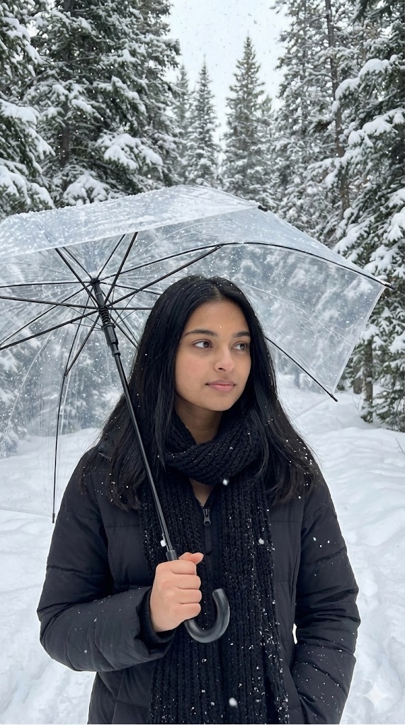 “A portrait of a beautiful woman with long black hair, fair skin, and delicate features, wearing a black puffer jacket and a black knitted scarf, holding a clear umbrella in a snowy forest. The image should capture the gentle falling snow and the serene winter atmosphere. She has a subtle, thoughtful expression, looking slightly off-camera. The style should be realistic with soft, natural lighting, similar to a high-quality photograph. Use same to same face as given reference pic.”